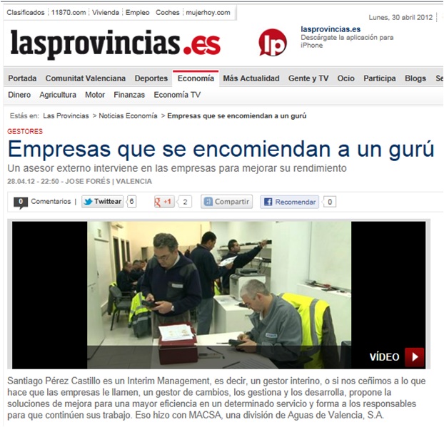 Santiago Pérez-Castillo es un Interim Manager, es decir, un gestor interino, o si nos ceñimos a lo que hace que las empresas le llamen, un gestor de cambios, los gestiona y los desarrolla, propone la soluciones de mejora para una mayor eficiencia en un determinado servicio y forma a los responsables para que continúen sus trabajo. Eso hizo con MACSA, una división del Grupo Aguas de Valencia, S.A.